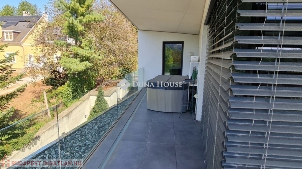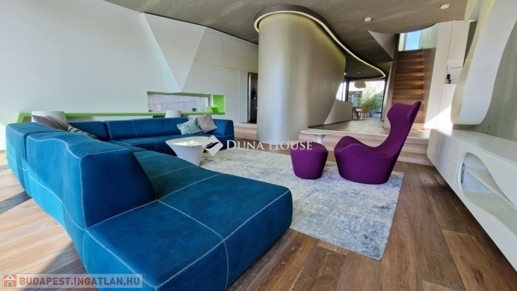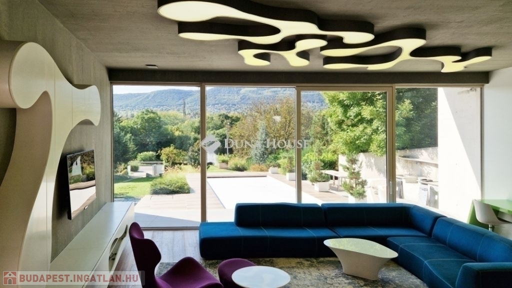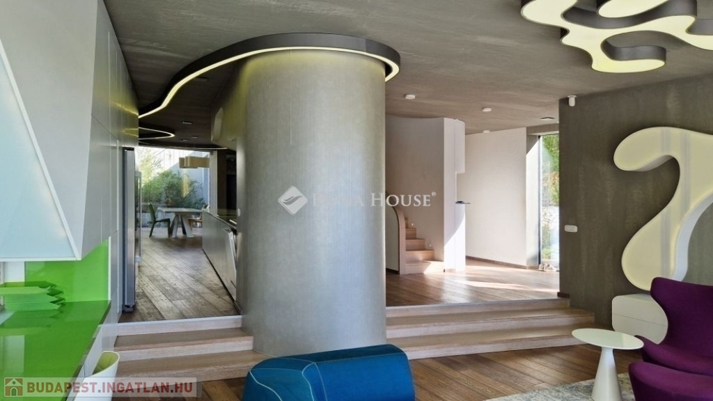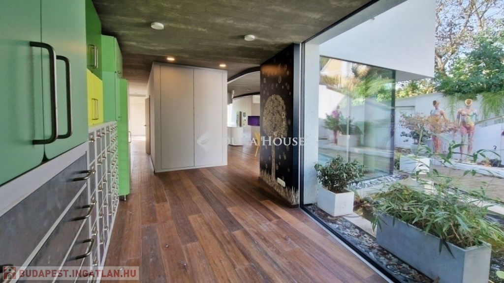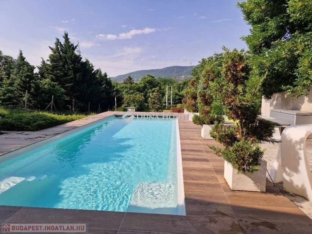 A földszinti 40 m2-es napsütötte, déli tájolású nappaliból tudunk kilépni a medencés teraszra. Az öntözőrendszerrel felszerelt, gyönyörűen parkosított kert igazi megnyugvást ad egy sűrű nap után. A házhoz tartozik kerti konyha, jacuzzi és saját fitness terem is.