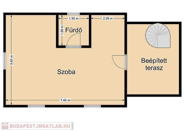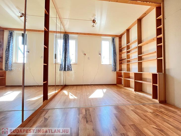 Jelenlegi elosztása a földszinten konyhából, kádas fürdőszobából és egy tágas térből áll, ahol egy térelválasztó könyvespolc és egy egyedi beépített tükrös gardróbszekrény található. A külön bejáratú emelet egy szobából és fürdőből áll, amely még befejezésre vár.