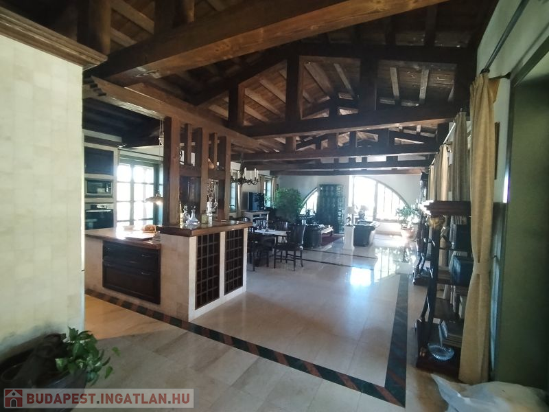 A felső szinten a hatalmas méretű nappali-étkező-konyha mellett még két hálószobás lakosztály és fogadótér van.