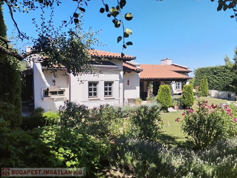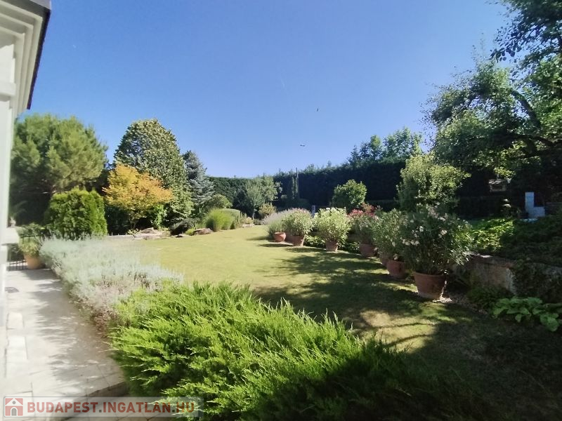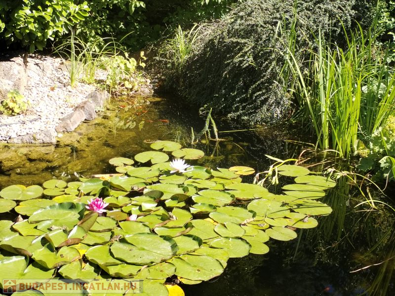 A házat körülölelő álomszép kertben kis pihenők, tavirózsás halastó, gyönyörű növényzet, mely nemcsak szemet gyönyörködtető, de maximális intimitást is biztosít az itt lakóknak.