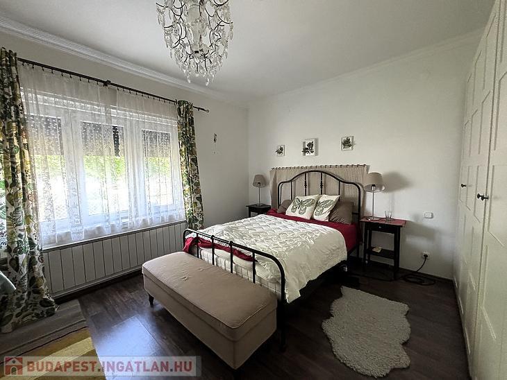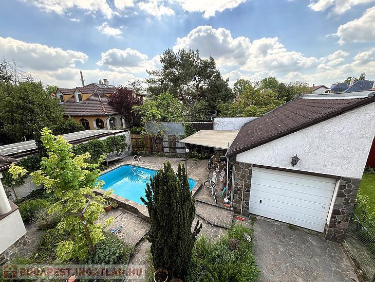 IV. kerületben, Újpest-kertváros részen, 347nm-es telken, bruttó 110nm-es, nettó: 94nm-es, előkertes, három fekvésű (É/D/Ny), duplakomfortos, 3 szobás, földszinti házrész eladó, 35nm-es pincével, saját 200nm-es medencés kerttel, autóbeállóval, garázzsal.