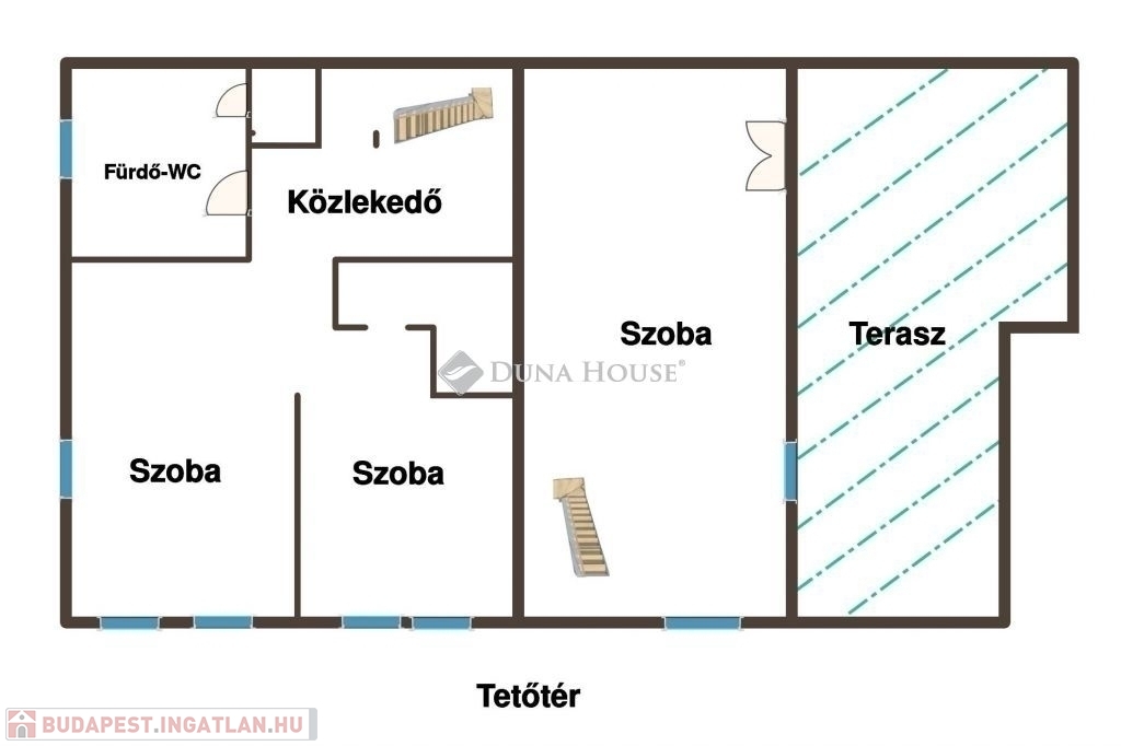 Az előszobából lépcső vezet fel a két tetőtéri szobába, ahol a kisebbik szoba gardróbbal is ellátott. Természetesen itt is fürdő-wc kiépítésre került.