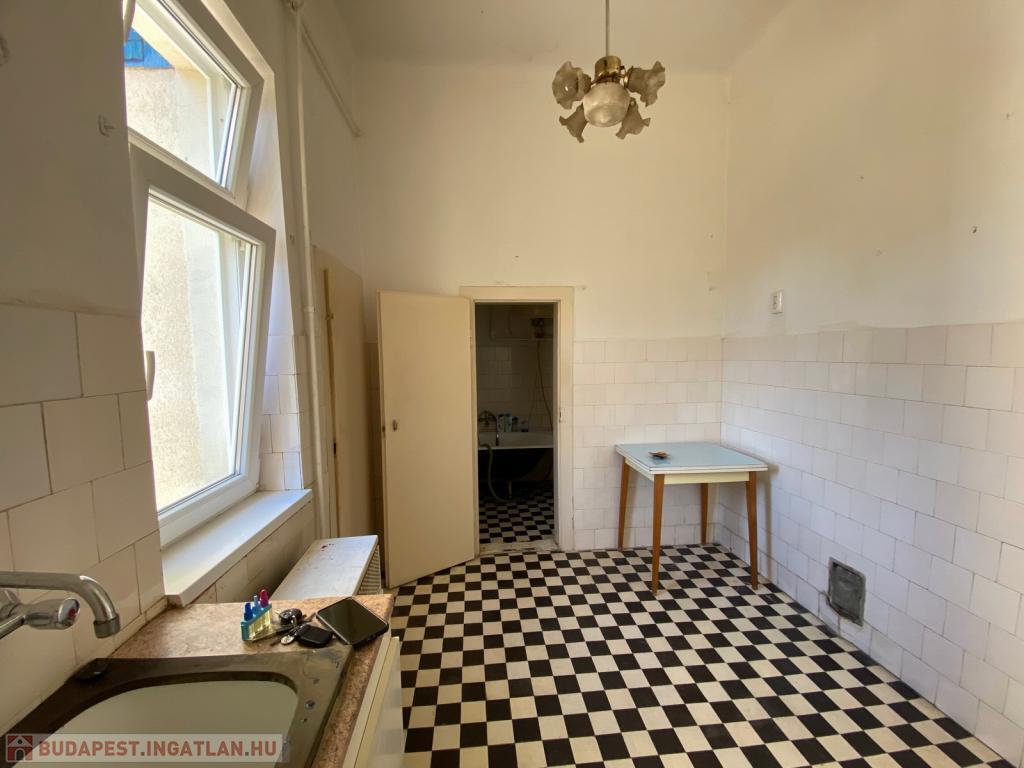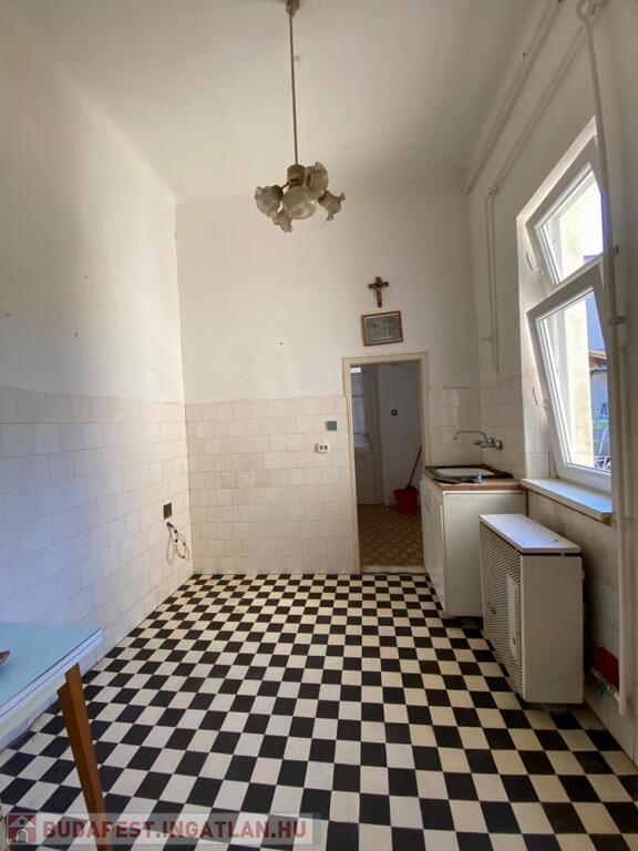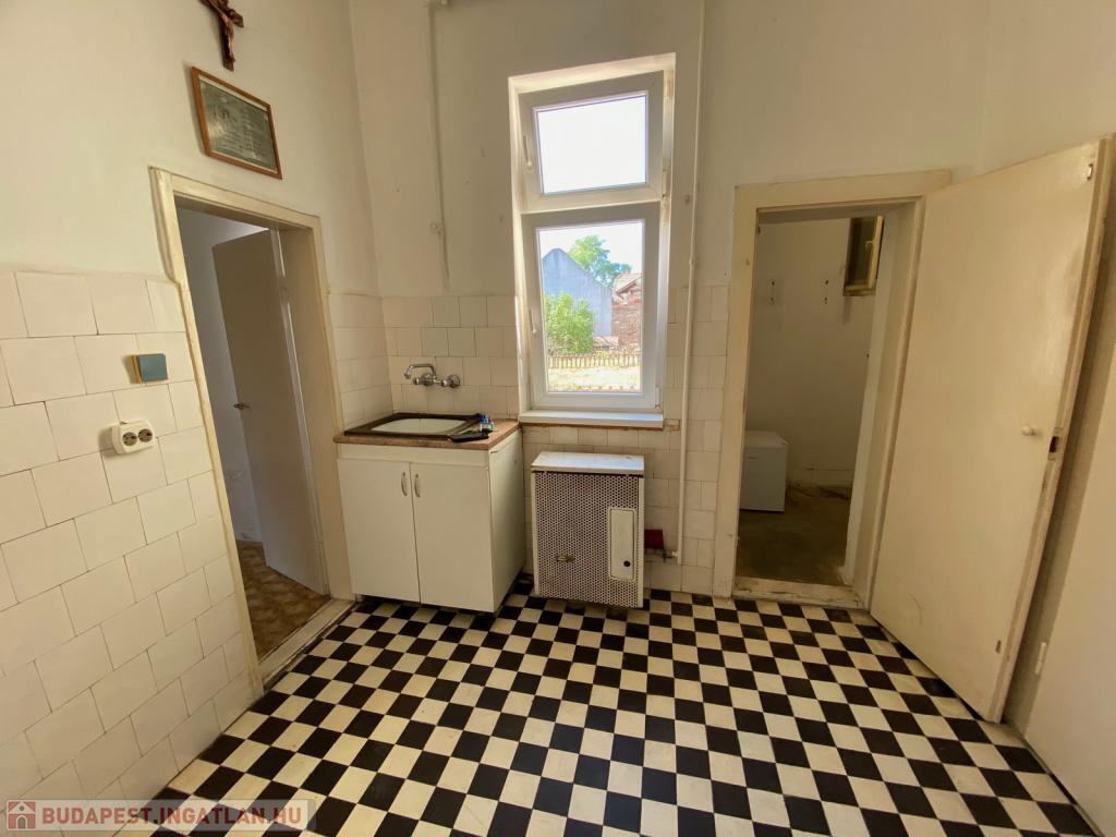 A konyha kertre, illetve belső udvarra néz, praktikus kamrával, mely lebontható, mert látott már szebb napokat.