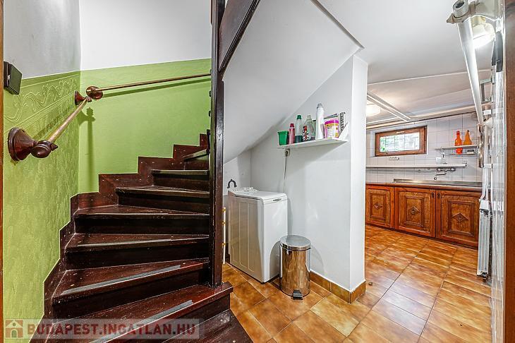 Az alagsort a házon belül lépcsőn, illetve az utcafront felől a garázskapun keresztül is megközelíthetjük. Itt 1 autóbeállót és további kettő helyiséget találunk, egy mosókonyhát, illetve egy tárolót, ahol a lakás gépészete kapott helyet. A lakás melegéről központi kazán gondoskodik.