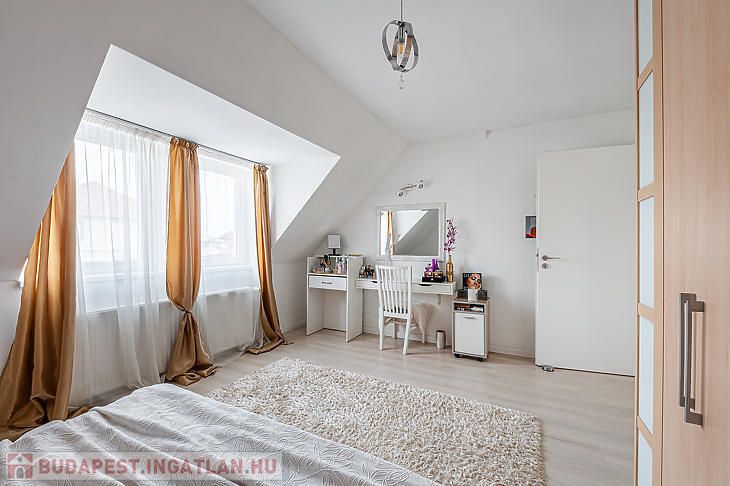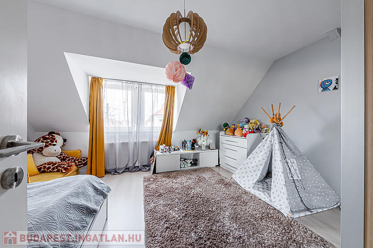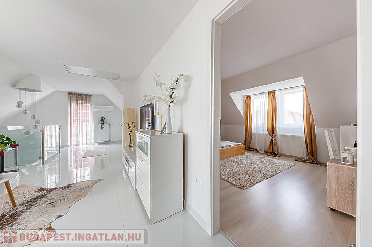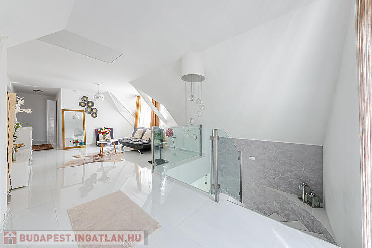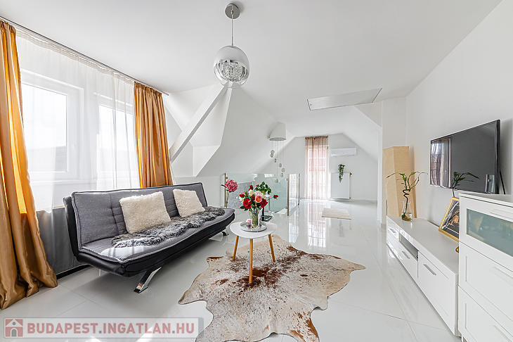 Az ingatlan elosztása kiváló, az alsó részen egy hatalmas nappali található, konyhával és étkezővel, a felső szinten pedig két szoba és egy tágas fürdőszoba lett kialakítva.