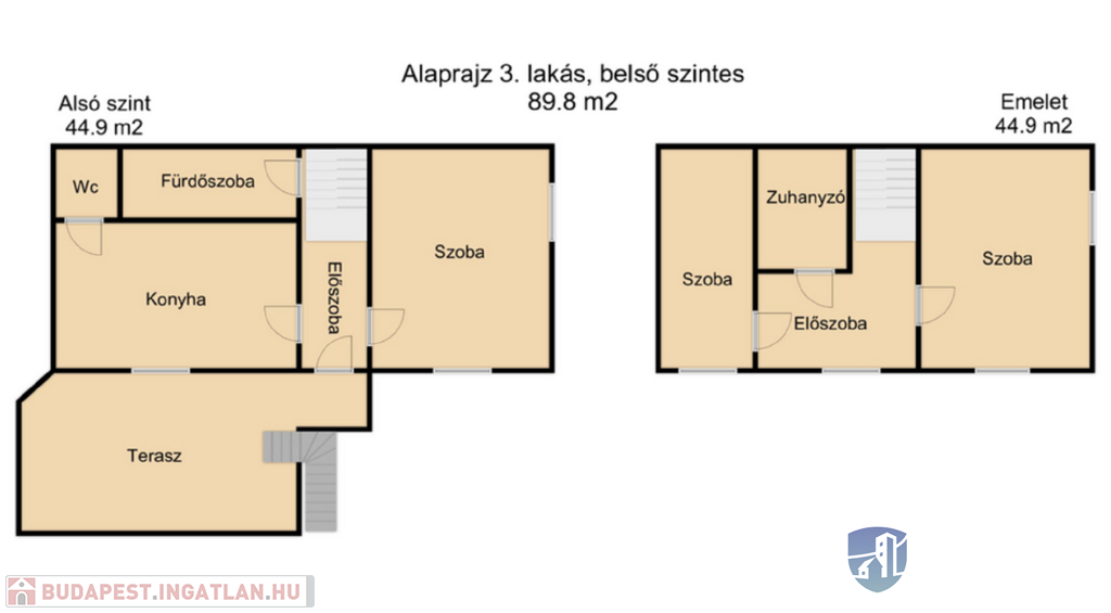 - A felső szint 2 szobából, egy fürdőszobából és egy előtérből áll.