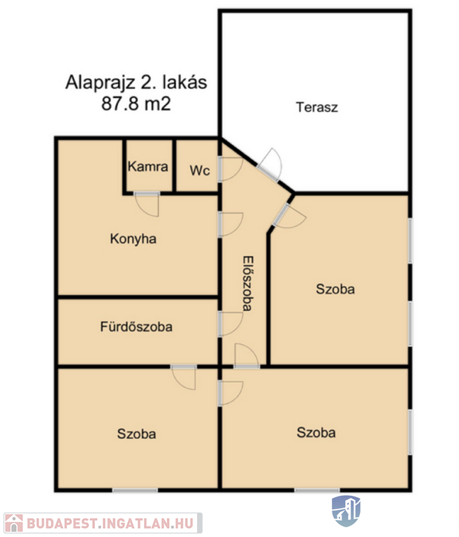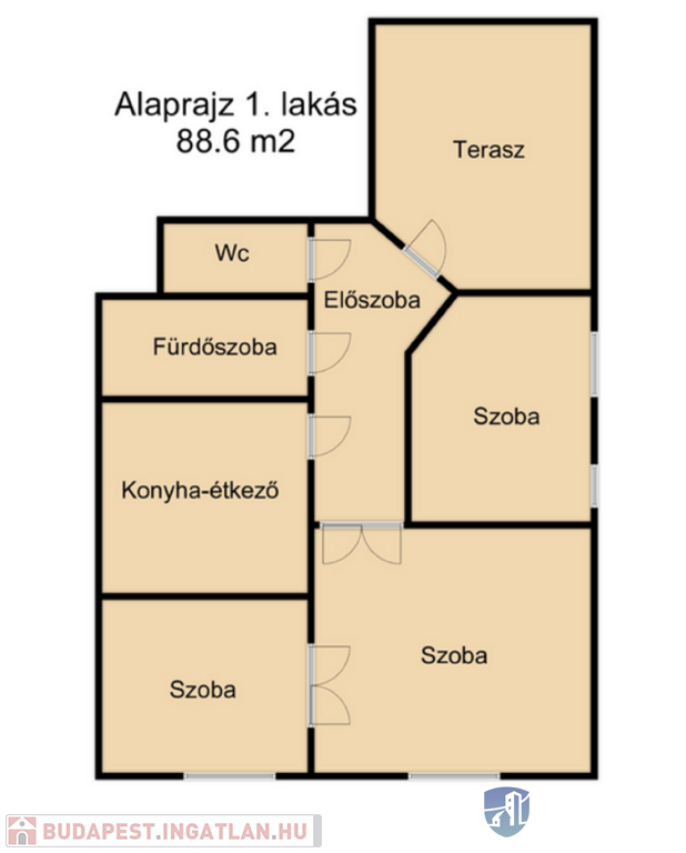 - 3 szobából, egy étkezős konyhából, 2 külön Wc-ből, egy fürdőszobából és egy előszobából áll.