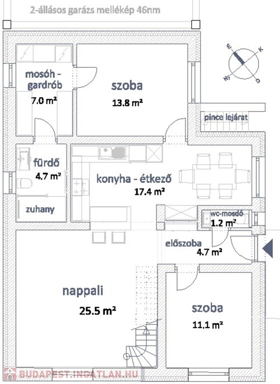 a lakóházhoz csatlakozó könnyűszerkezetes garázs melléképület (kb. 46nm)