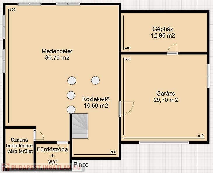 A pince szinten található egy beltéri, fűthető medence és egy dupla beállásos garázs. A garázs előtti autóbeálló kettő autó parkolására alkalmas. Illetve az utcán kialakításra került 4 db autóbálló hely.