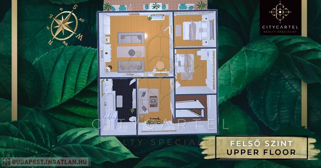 Felső szint: előtér/társalgó, 2 hálószoba, nappali, világos, ablakos fürdőszoba káddal, zuhanyzóval és WC-vel, terasz, padlásfeljáró