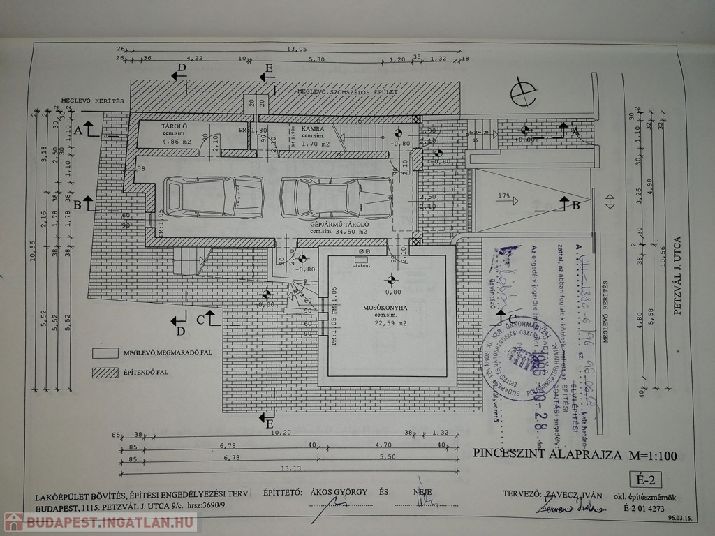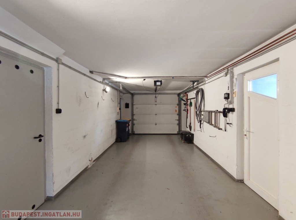 A családi házba a távirányítású elektromos kiskapun keresztül az előkerten áthaladva a több ponton záródó biztonsági bejárati ajtóhoz jutunk. A bejárati ajtóból balra nyílik a 34 nm garázs, ahol egymás mögé két személykocsival is be lehet parkolni. Innen balra nyílik egy 22,6 nm-es járólappal burkolt mosókonyha, ami mosógéppel felszerelt, itt található a gázkazán, ami az egész ház fűtéséről gondoskodik, továbbá a beépített házközponti porszívó rendszer is, ami biztosítja minden szinten a zajtalan pormentes takarítást. A garázs jobb oldalán nyílnak az 1,7 nm-es és 4,9 nm-es tárolók polcrendszerekkel. A garázsból jobbra kilépve a zárt lépcsőházból vezet fel a ház első szintjére. Belépve a bejárati ajtón a járólappal burkolt 7,6 nm-es előtér fogad minket, ahonnan jobbra a 10,6 nm-es ablakos, járólapos konyha nyílik, ami jelenleg nem bútorozott, ebből kifolyólag az új tulajdonos a saját ízlésére formálhatja. Innen kilépve az előtérben tovább haladva balra a fürdőszoba található, ami magában foglalja a toalettet is. Innen kilépve balra a 13 nm-es ablakos, fa parkettás hálószoba következik. Ezzel a szobával szemben nyílik a 24,13 nm-es, szintén fa parkettás, ablakos nappali szoba, ami a belső kertre néz. Ezen a szinten már a beépített házközponti porszívó rendszerrel lehet takarítani. A meleget radiátorok biztosítják, a felszerelt klíma nyáron kellemesebbé teszi a hőérzetet.