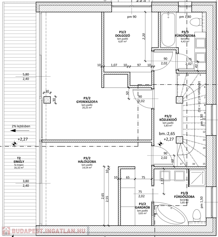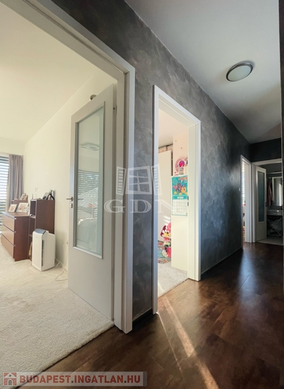 Az emelet hálószoba, gardróbszoba, gyermekszoba, dolgozó szoba és két fürdőszoba kiépítésű. A fürdőszobák kádas/zuhanyzós, illetve sarokkádas kialakításúak. A háló és gyermek szobából az épületen végig húzódó 16 m2 területű, panorámás teraszra léphetünk.