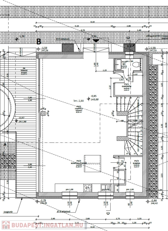 A földszinten található az amerikai konyhás nappali, gardrób, kamra, zuhanyzós fürdőszoba. A nappali közvetlen kapcsolatban van egy 22 m2 területű terasszal. Konyhája egyedi építésű konyhabútorral beépített, benne Bosh típusú konyhagépekkel, melyek az ár részét képezi.