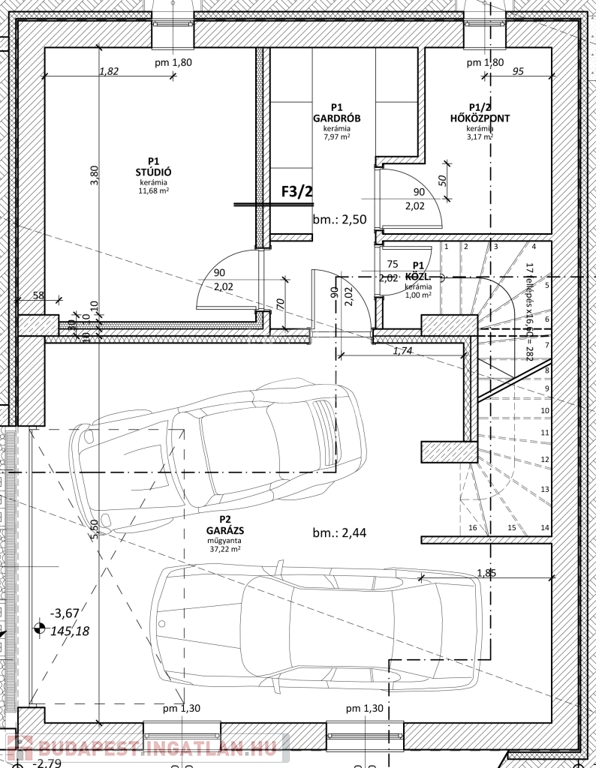 Az alsó szint kétállásos garázs, közlekedő, hangszigetelt dolgozó szoba, gépház tagozódású.