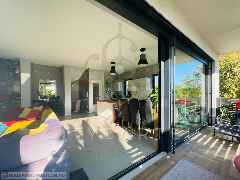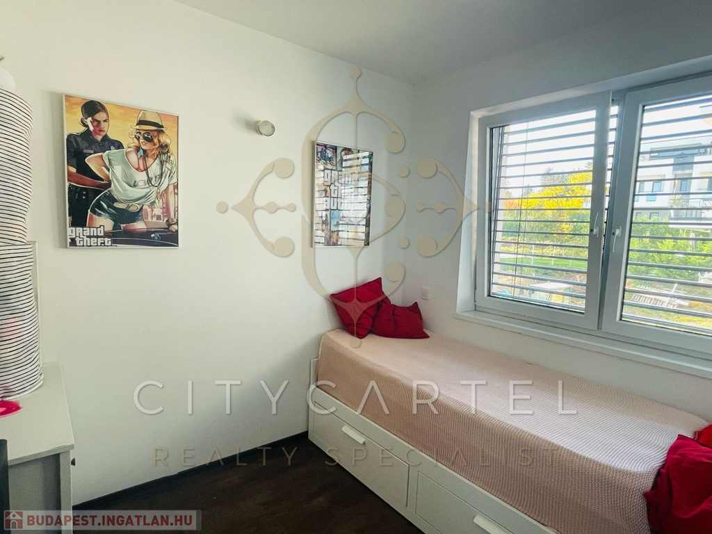 Minden ablakon elektromos zsaluzia, prémium minőségű beépített konyhabútor Bosch gépekkel, egyedi gyerekszoba bútorok, eloxált alumínium korlátok.