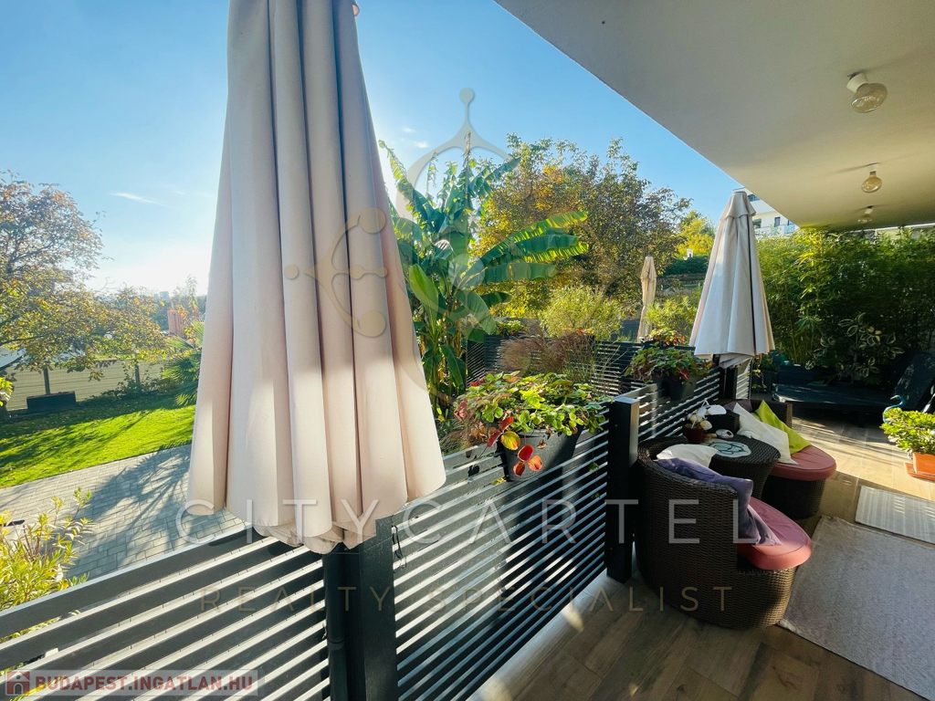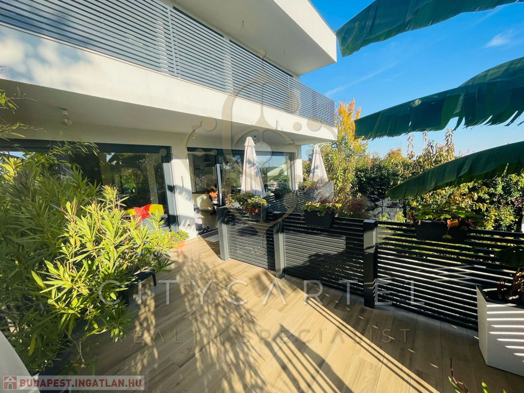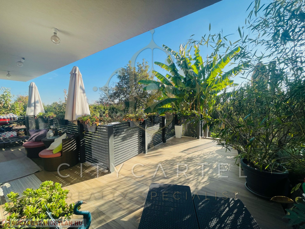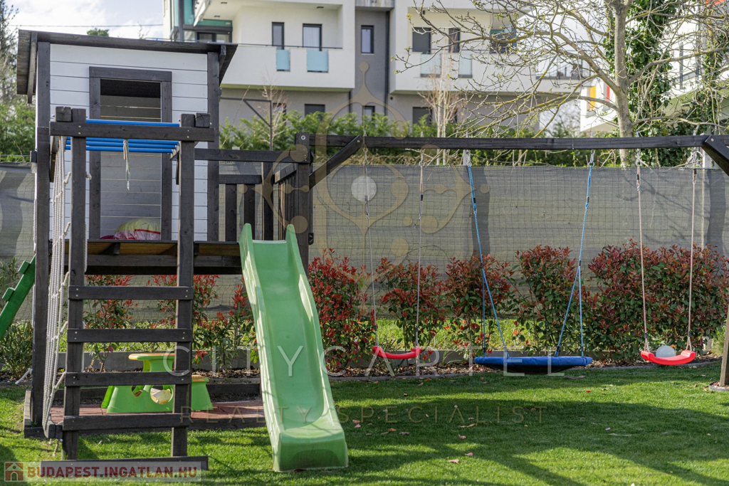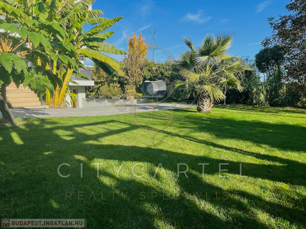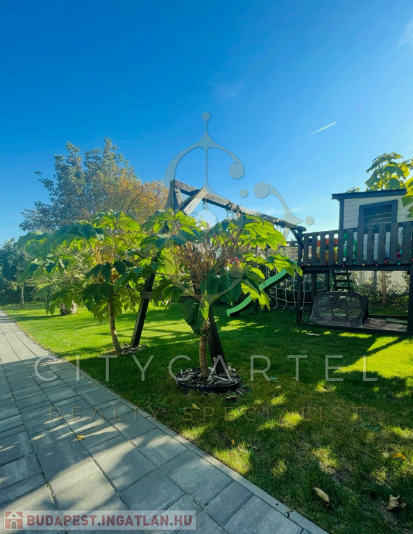 A gyönyörűen gondozott kertben 2 éve épült, karbantartott játszótér, gyümölcsfák, egzotikus növények és automata öntözőrendszer található, külön kerti vízmérővel.