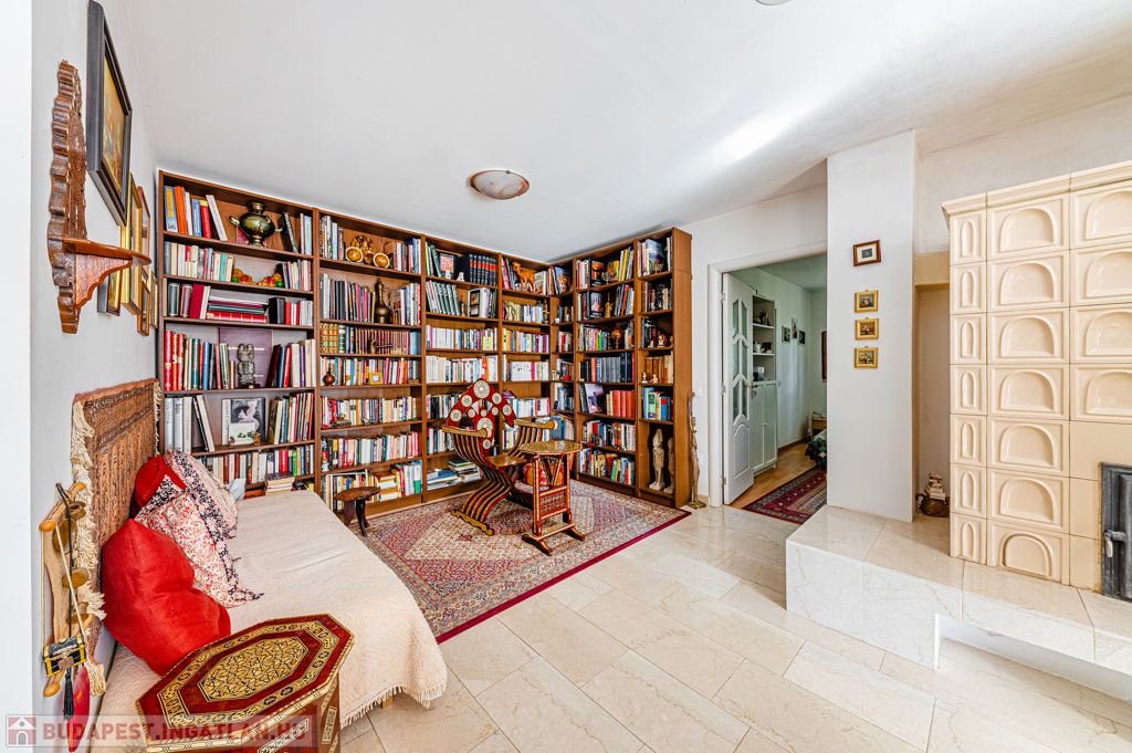 A földszinten tágas, óriási teraszhoz kapcsolódó nappali és étkező-konyha adja a központi életteret, amelyet a három helyiséghez is kapcsolódó, gyönyörű kerámia elemekkel épített cserépkályha tesz különlegessé.