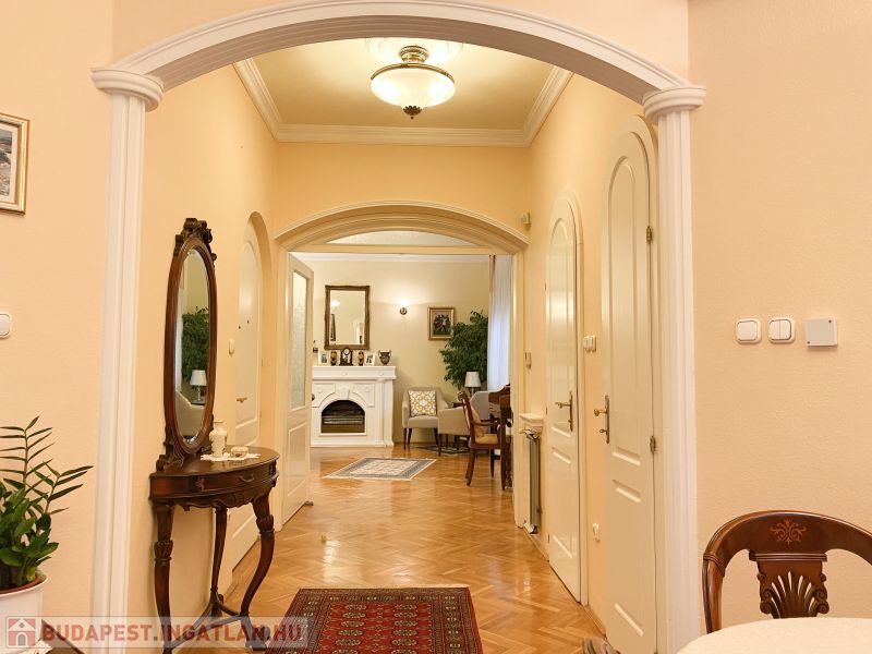 A középső szint 3,1 méteres belmagassága a tágasság érzetét adja. Egyedi belső ajtók, kandallós nappali, gépesített konyhák, visszafogott gipszstukkó díszítések, motoros redőnyök, légkondicionálás, riasztó, szép kovácsoltvas korlátok.