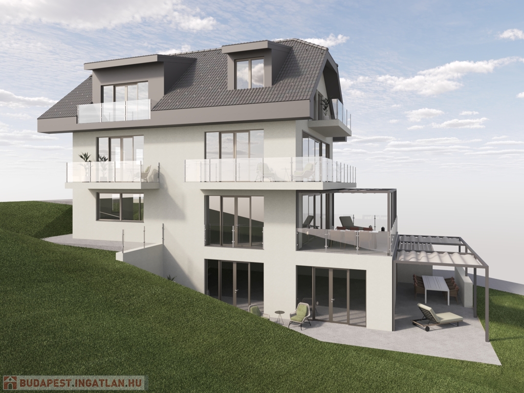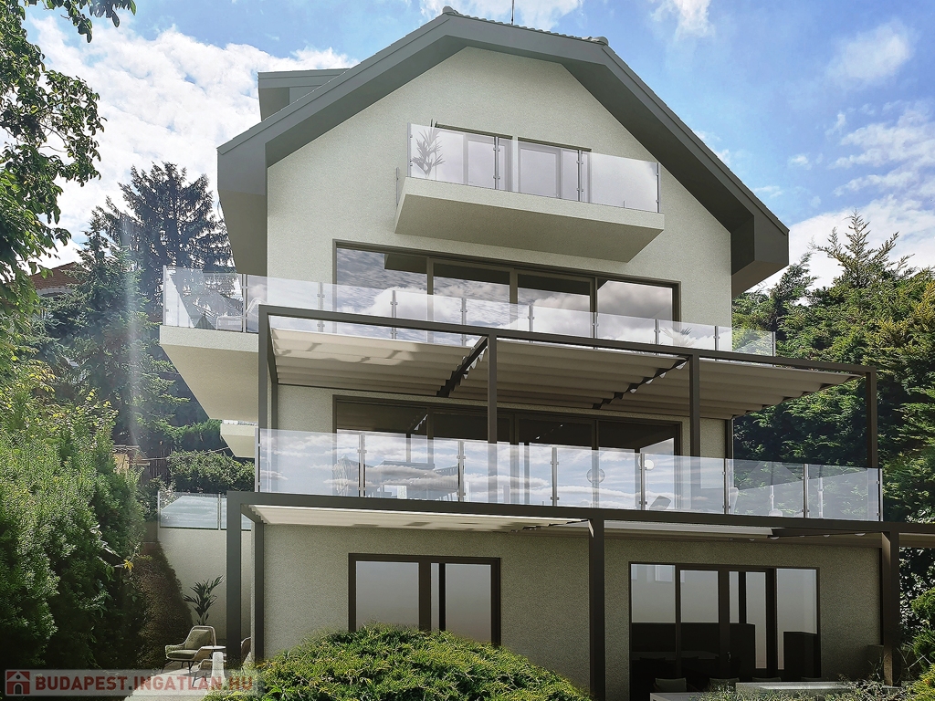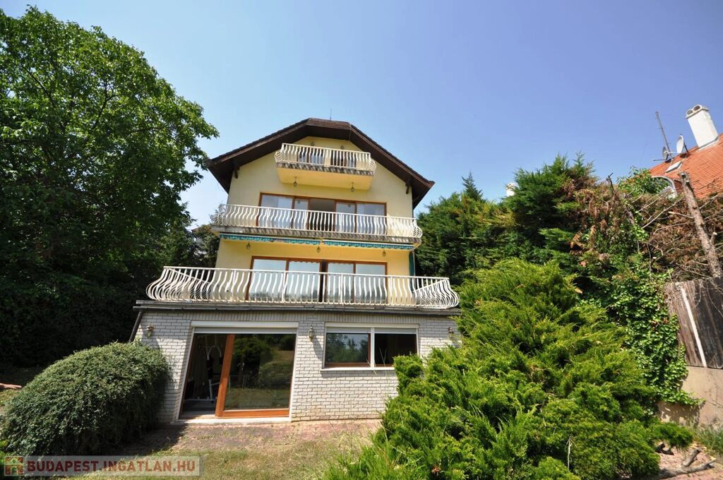 XII. Széchenyihegy egyik legkedveltebb, csendes, zöld mellékutcájában jó állapotú, minőségi anyaghasználattal saját célra megépített, brutto 450 nm lakóterű, több - összesen 64 nm - terasszal bíró, hegyvidéki panorámás, 8 szobás, igényes - akár HÁROM-NÉGY LAKÁSSÁ ALAKÍTHATÓ - családi ház eladó.