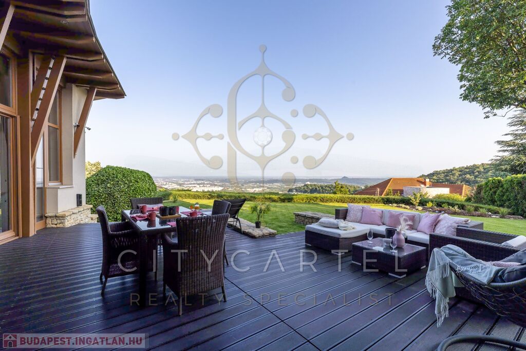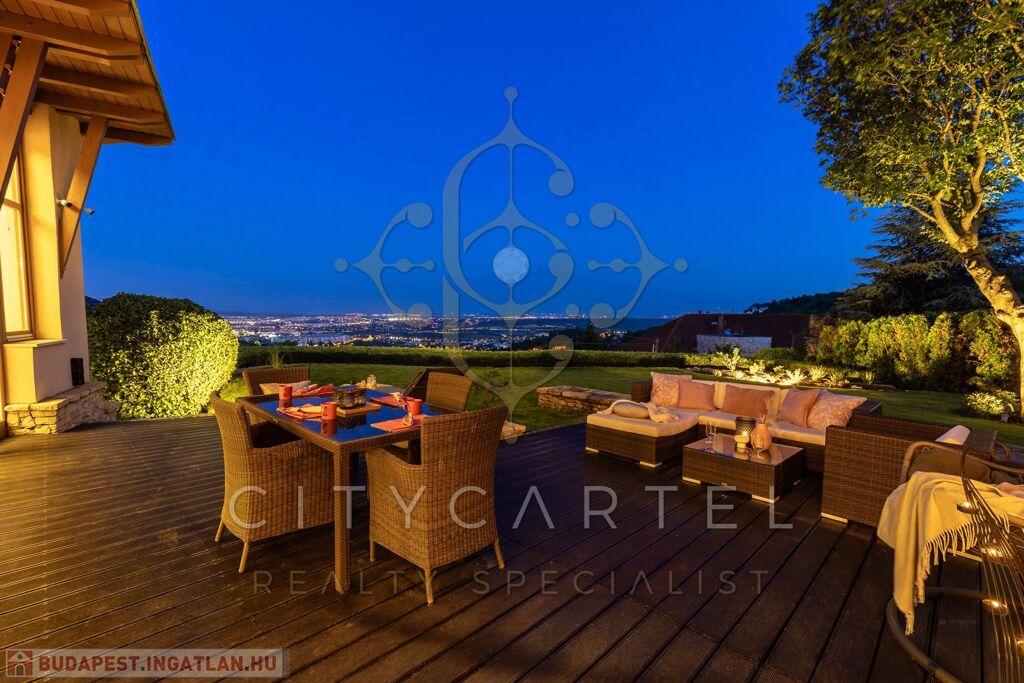 Panorámás, 50 nm-es kertkapcsolatos terasz – városi nappali és esti fényben úszó lenyűgöző látványával és erdei kilátással