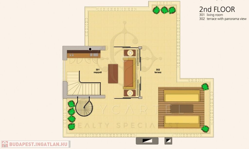 2. emelet (27 nm) + 133 nm terasz + 46 nm tetőterasz (jacuzzi, szauna elhelyezhető)