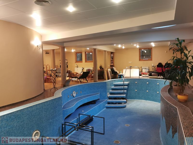 * Alsó szint 260 m2: garázs, wellnesz rész: nagy méretű belső medence, finn és infraszauna, merülő dézsa, fitneszrész, társalgórész