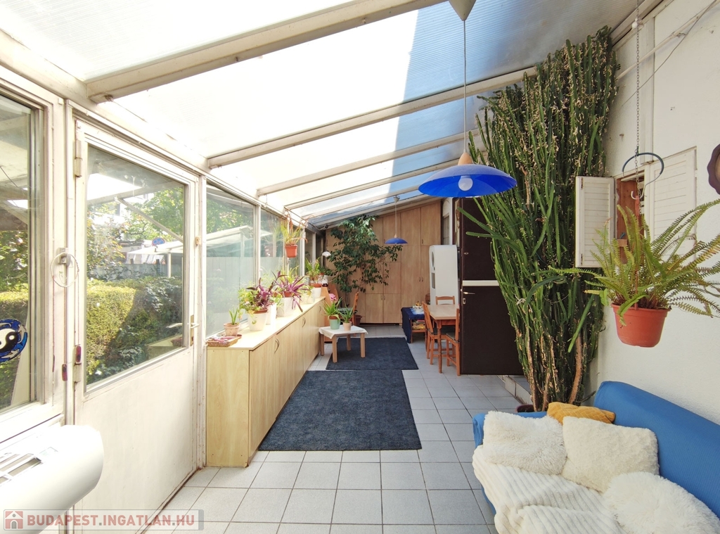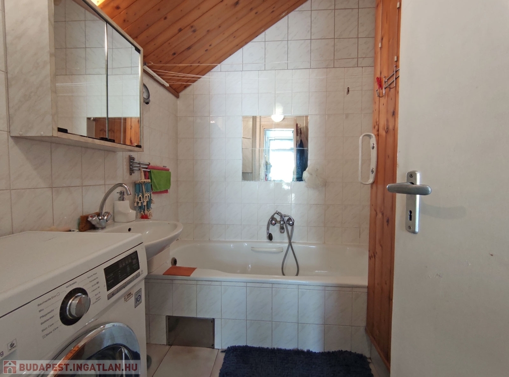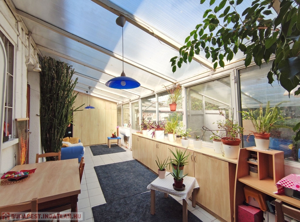 Az udvarba a fém biztonságos bejárati kapun keresztül jutunk. Belépve a virágokkal beültetett kerten át érkezünk a klímával felszerelt télikertbe, ahol kellemes a pihenés. Az alsó szinten, jobbra a fa parkettával burkolt szoba, mellette a kádas fürdőszoba, amiben egy westen kondenzációs kazán szolgáltatja a fűtést, külön helységben a toalett. Balra tovább a gépesített, bútorozott konyha ennek az ablaka a téli kertre néz, szemben a másik szoba és az emeletre vezető fa lépcső található. A felső szinten balra nyílik egy szoba, szemben a kádas fürdőszoba, jobbra halva egy kényelmes ablakos hall, mellette a félszoba nyújt kényelmes életteret a család minden tagjának. A lépcső fölött beépített könyves polc, mellette a szoba bejáratánál mindkét oldalon, beépített tárolók vannak. Ez a ház kiváló több gyerekes családoknak, de akár befektetőknek is vállalkozás elindításához kitűnő lehetőség. A használati megosztás folyamatban van.