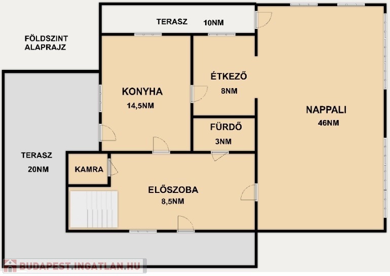 A házba a kis teraszon keresztül jutunk, és a házba lépve tágas előszoba fogad minket. A földszinten jobb kéz felé haladva a 46nm-es világos, nappali található, mely alkalmas nagy családi összejövetelekre, vagy társaság fogadására is. A nappaliból nyílik az étkező, mely kijárattal rendlkezik a konyhába. A konyha is nagy térrel rendelkezik, 2 bejárattal, az előtérből és étkezőből is megközelíthető. Kijárata van a teraszra.