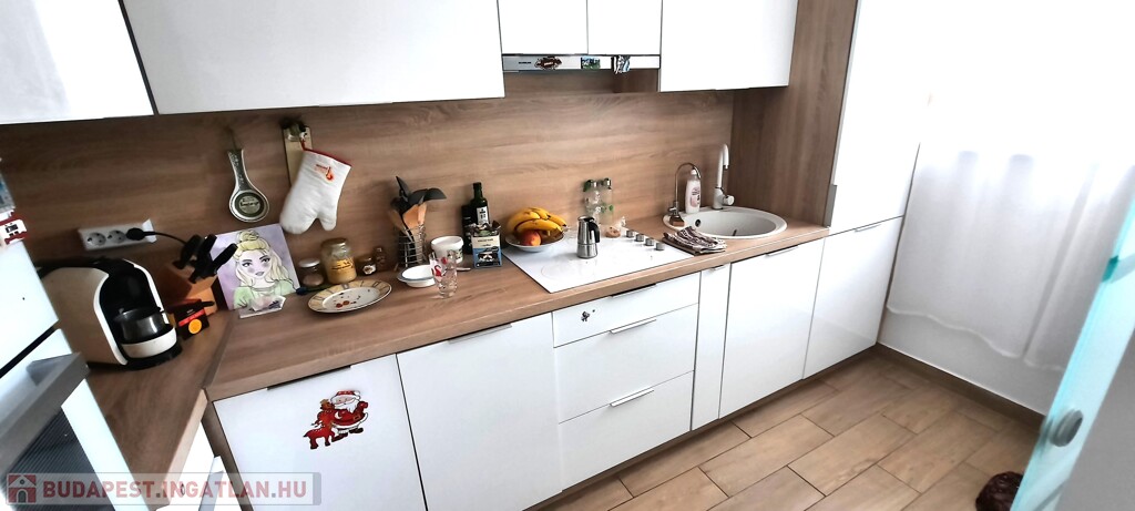 A konyha ízlésesen berendezett, gépesített, teljes berendezéssel a vételár részét képezi. A fürdőszoba szintén.