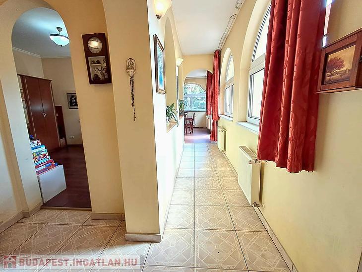 Tágas nappali, 3 szoba (egyik szoba jelenleg étkezőként funkcionál, konyha, 2 fürdőszoba, előszoba és közlekedő áll rendelkezésre. A teljes víz-, villanyhálózat 2010-ben lett felújítva, ekkor történt meg a fűtésrendszer korszerűsítése is. A fűtésről kondenzációs kazán és lapradiátorok gondoskodnak és egy hűtő-fűtő klíma is rendelkezésre áll. A nyílászárók műanyagok, hőszigeteltek, minden ablak szúnyoghálóval van ellátva. A burkolatok szép állapotban vannak. A konyhabútor a vételár részét képezi, a többi berendezés megegyezés tárgya. A nappaliból is megközelíthető a 20 m2-es terasz.