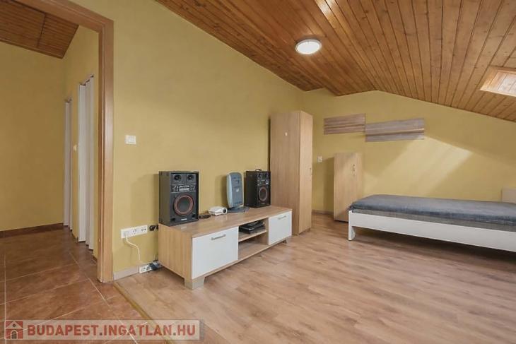 A 130 m2-es rész a telek végében van, 2 szintes, itt 4 darab, 33 m2-es, 1 szobás garzonlakás van. Ezek jelenleg albérletben vannak kiadva, így kiváló lehet akár befektetés szempontjából is (akár bérlőkkel együtt). A lakások fel lettek újítva, mindegyikben klíma került beszerelésre. Új zöld kazán lett kialakítva, illetve gáz cirkó is biztosíja a fűtést.