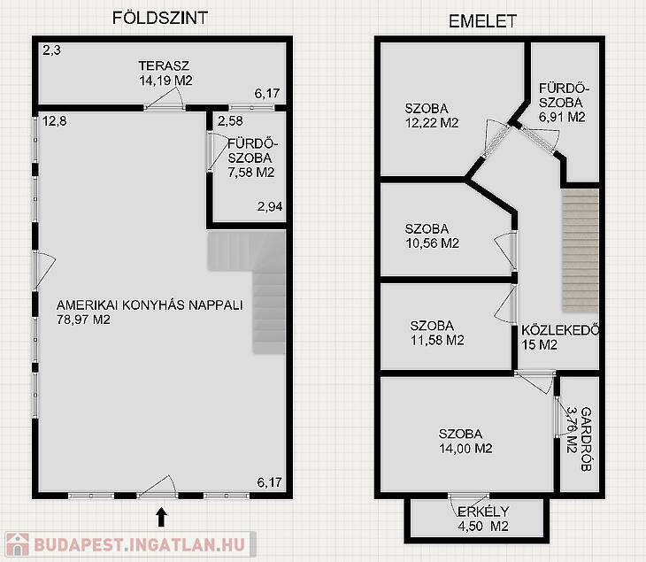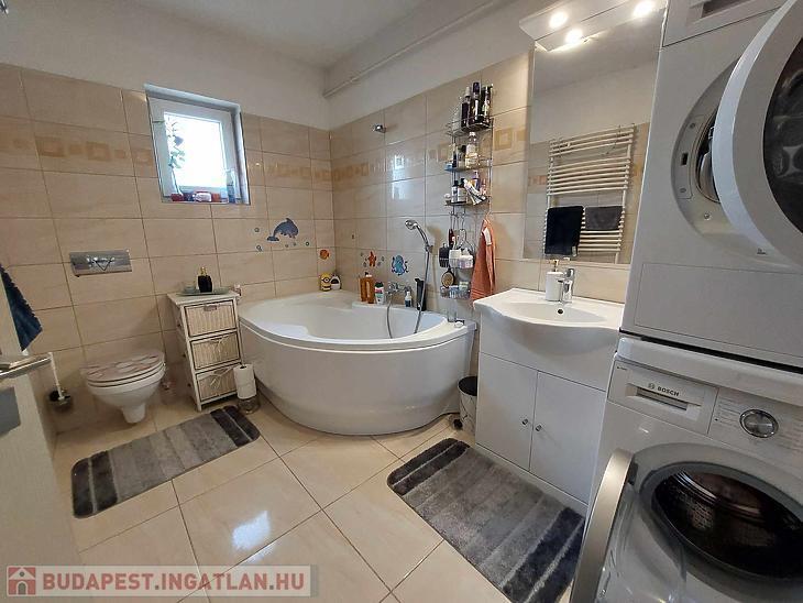 Az ingatlan belső 2 szintes, a földszinten egy hatalmas amerikai konyhás nappali és fürdőszoba található, az emeleten 4 szoba (egyik szoba gardróbbal is rendelkezik), fürdőszoba, közlekedő és erkély került kialakításra. A szobák laminált parkettásak, a többi helyiség járólapos.