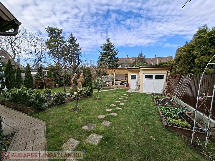 A kertben egy tárolóval és terasszal egybeépített garázs található, valamint automata öntözőrendszer működtethető. Riasztó- és kamerarendszer, valamint elektromos kapu van felszerelve.