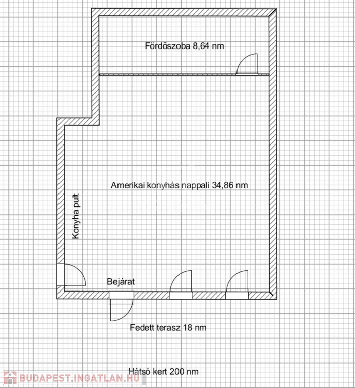 Alapterülete 44 nm, jelenleg 1 nagy szobás, amerikai konyhás elosztású, de könnyedén 1,5-2 szobássá alakítható több féle alaprajzi lehetőséggel.