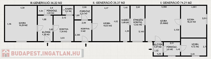 Az I. generációs 75 m2, itt 3 szoba, konyha, előtér, fürdőszoba. kamra és egy 9 m2 terasz található.