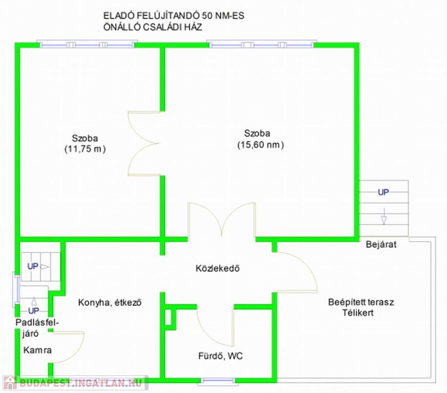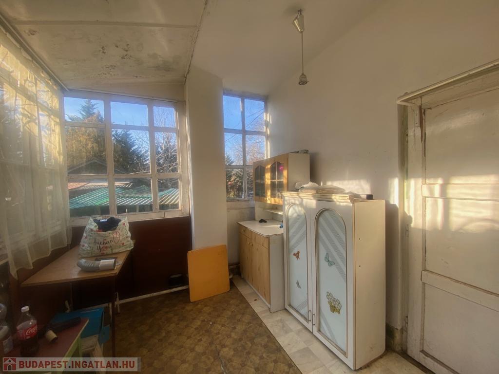 Eladó Budapest XV. kerületében, Rákospalota csendes, családi házas övezetében egy 389 nm-es telken elhelyezkedő, előkertes, 50 nm-es, 2 szobás, beépített teraszos önálló családi ház.