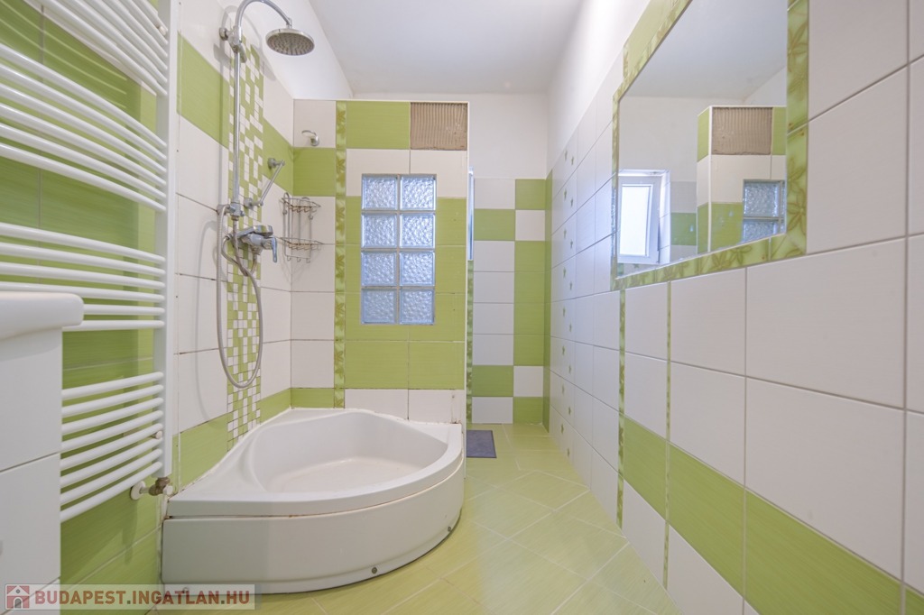 Az alsó és a felső szinten is teljes értékű fürdőszoba található, lent külön, fent egy helyiségben a WC-vel. Lent található háztartási helyiség is. A 4 hálóból egy dolgozó, 3 pedig nagy méretű, teljes értékű, de a dolgozó felől található a műhely, mely irányába könnyen bővíthető a szoba, így a ház mind az alsó, mind a felső szinten.