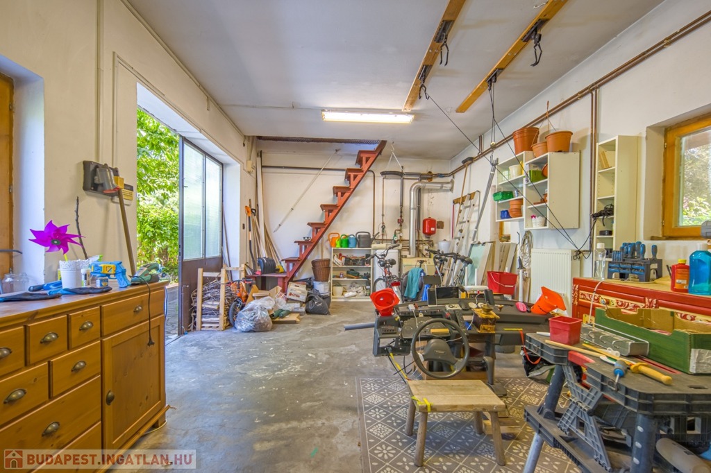 A műhely átalakítható, többfunkciósként használható: garázsként vagy további szobák és vizes helyiség kialakítására is van lehetőség, mivel a ház folytatólagos részénél van. A telken rengeteg fa és virág mellett egy 10 m2-es szaletli is található.