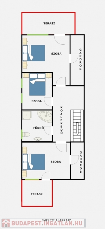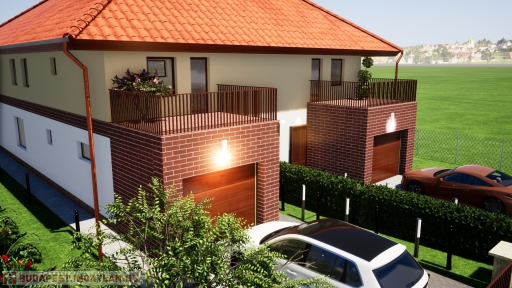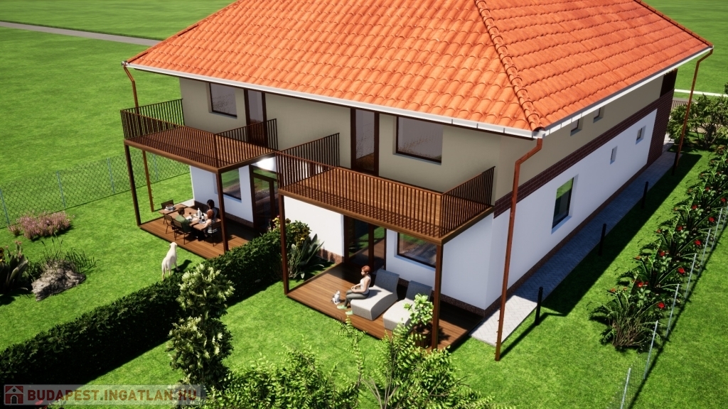 Eladó XVI. Cinkotán, kellemes családi házas övezetben, szép széles, mégis kis forgalmú utcában, új építésű, 159 nm-es, két szintes, amerikai-konyhás nappali (43 nm ) + 3 nagy méretű hálószobás, dupla-komfortos, 3 teraszos ( 13, 12 és 11 nm-es), minőségi színvonalon és anyagokból megépített, körbenapozott, rendkívül alacsony fenntartású, saját helyrajzi számon lévő ikerházfél ( jogilag lakás) 426 nm-es saját lekerített telken.