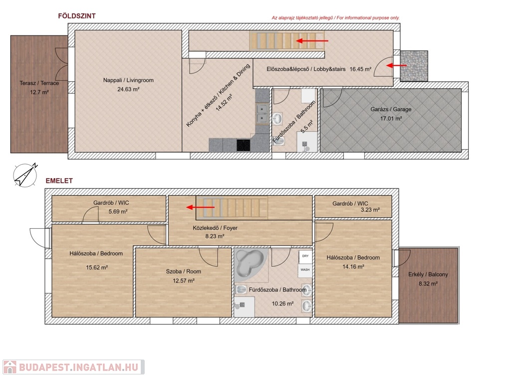 Duplakomfort: 2 fürdőszoba, 2 wc, zuhanyzó + kád, minden szinten mosógép csatlakozással