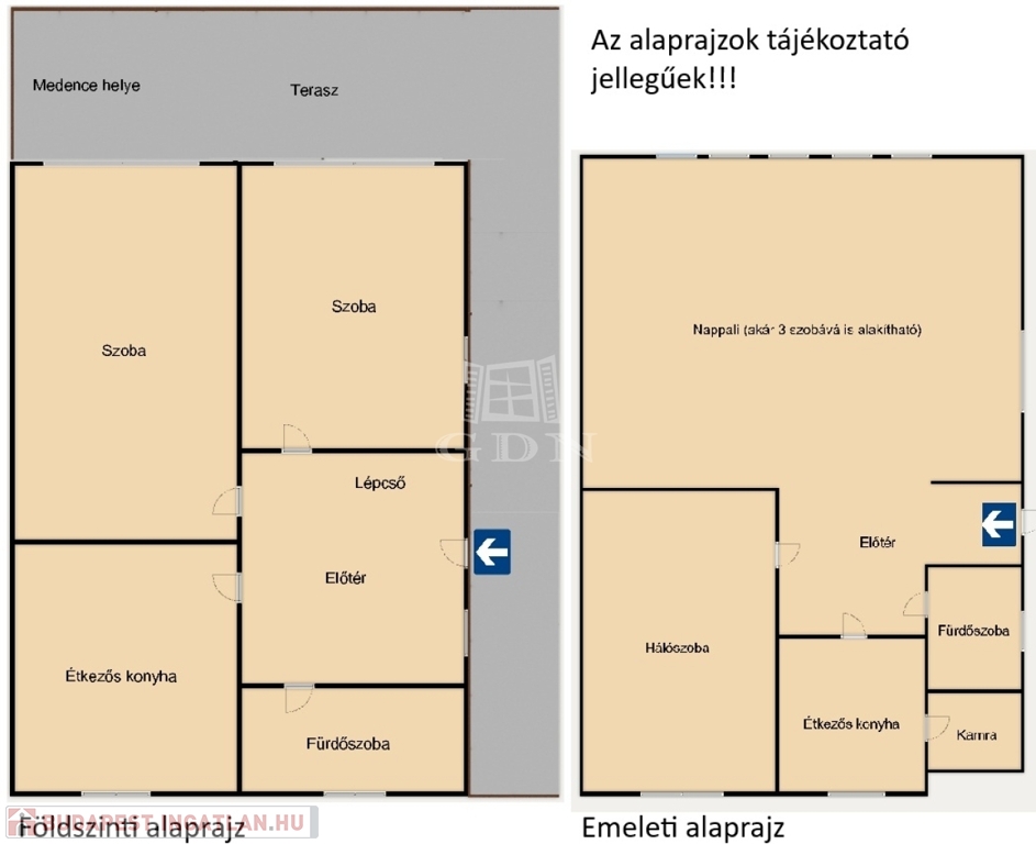 A földszinti részen kényelmes előtér, 2 szoba, nagy étkezős konyha, fürdőszoba, lépcső fel - és lejáró, terasz (esetleges medence kialakítással) kapott helyet.