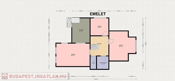 Emelet: 116 m²-en 3 hálószoba, 20 m²-es terasz, fürdőszoba, külön mellékhelyiség és előtér található.