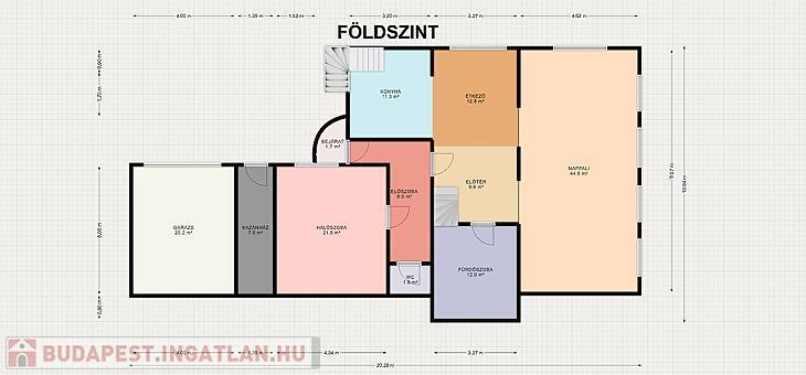 Földszint: Előtér, amerikai konyhás nappali, hálószoba, kamra, fürdőszoba, lépcsőház