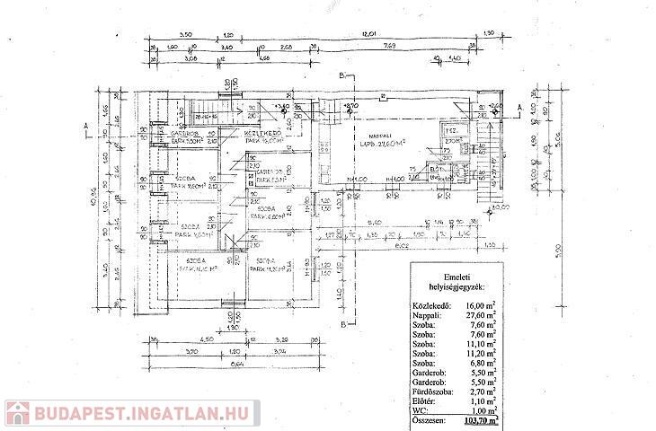 Emelet: 5 szoba, nappali, fürdőszoba, wc, 2 gardrób, előtér, közlekedő.