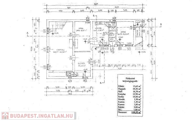 Földszint: Előszoba, hall, nappali, konyha + étkező, kádas fürdőszoba, 2 wc, 2 kamra, előtér, raktár.