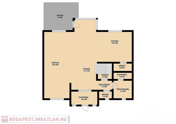 Földszint: amerikai konyhás nappali + étkező, zuhanyzós fürdőszoba, WC + mosdó, előszoba, kazánház, tároló, 16 m2-es terasz