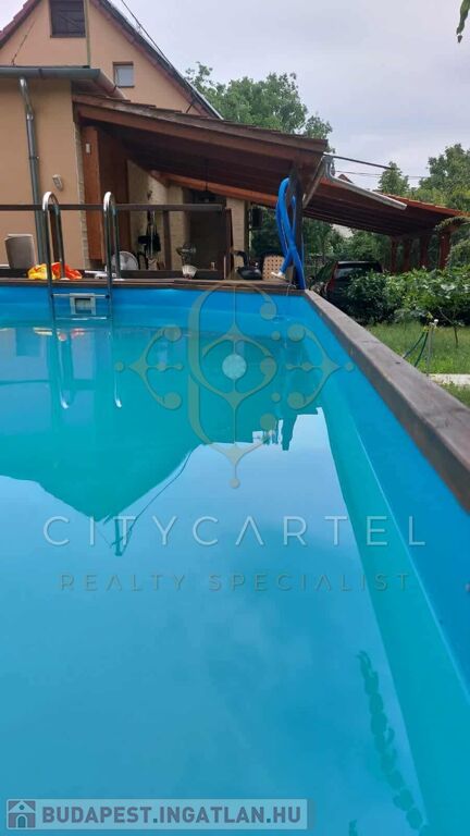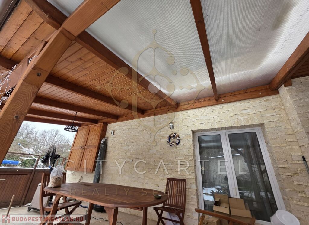 A gépkocsibeálló és terasztető igényes fa burkolatú. Hátul 6x4 nm-es hűszivattyús kültéri medence, köves szalonnasütő.