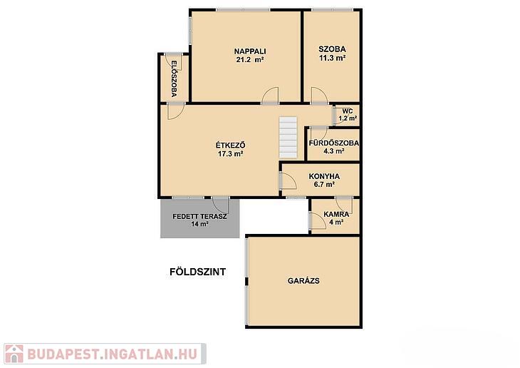 Földszint: nappali, szoba, konyha, étkező, zuhanyzós fürdőszoba, mellékhelyiség, közlekedő, előszoba, kamra, 14 négyzetméteres terasz.