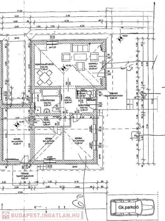 Amerikai konyhás nappali + étkező 10 négyzetméteres teraszkapcsolattal, 3 szoba, kádas fürdőszoba + wc, külön wc, közlekedő, előszoba.