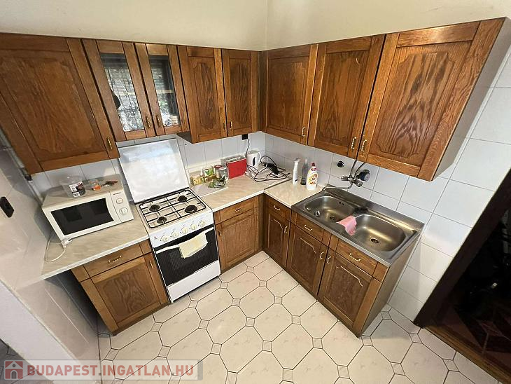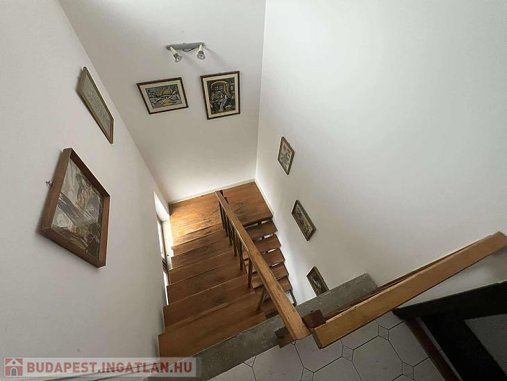 Emelet: 2 szoba, étkezős nappali, konyha, sarokkádas fürdőszoba, mellékhelyiség, 2 erkély. kamra.